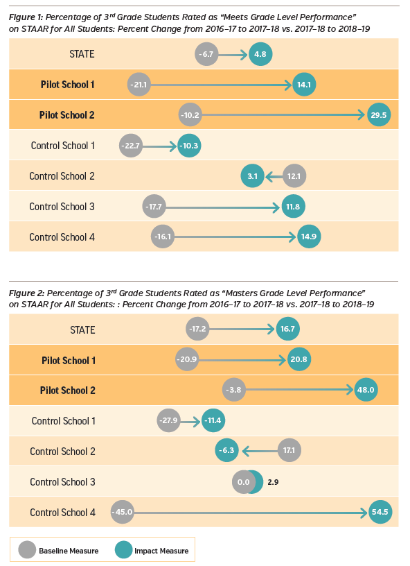 At the pilot schools, the implementation of FPC sparked a significant increase in third grade Texas state assessment STAAR results. The scores skyrocketed by a margin of up to 30 percentage points in the rankings of Meeting Grade Level Performance and Mastering Grade Level Performance, outperforming the average scores of the four control schools as well as the state average.